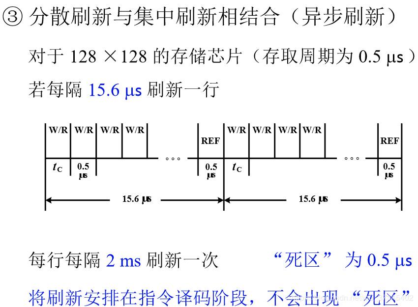 即每隔15.6μs刷新一行(2000μs/128≈15.6μs),而每行刷新的时间仍为0.5μs。这样,刷新一行只能停止一个存取周期,但对每行来说,刷新间隔时间仍为2ms,而死时间为0.5μs。(相对每一段来说,是集中式刷新,相对整体来说,是分散式刷新)