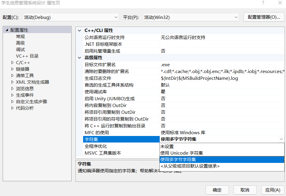 第三种:一次性解决:打开带cpp文件的属性(可以在资源管理器右边源文件下面右键找到或者vs上方项目里找到),然后配置属性->高级->字符集->高级属性->字符集->使用多字节字符集