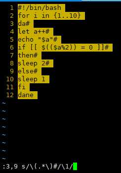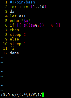 :3,9 s/(.*)/#\1/ 在前面原文基础上加上#井号