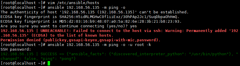 ansible 192.168.56.135 -o -u root -k 输入密码,即可远程登录