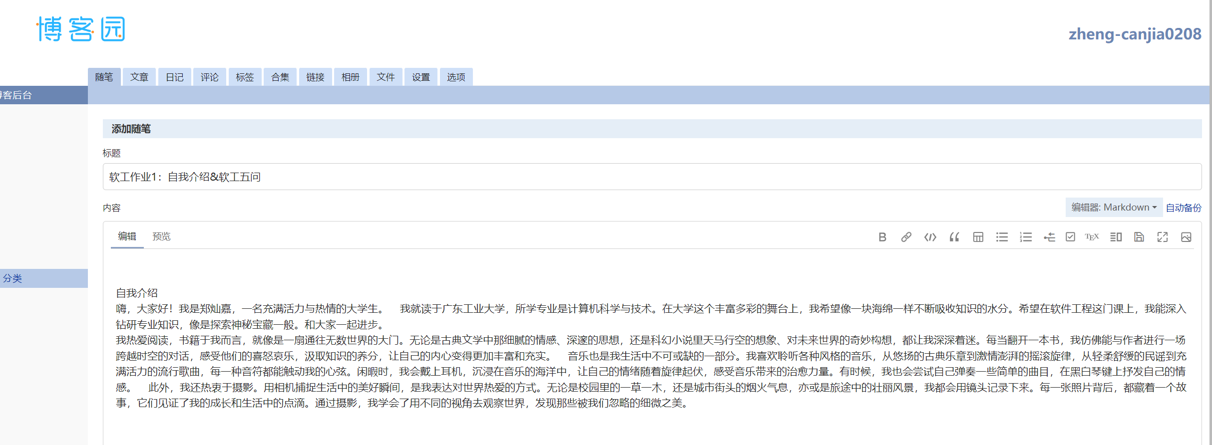 嗨,大家好!我是郑灿嘉,一名充满活力与热情的大学生。 我就读于广东工业大学,所学专业是计算机科学与技术。在大学这个丰富多彩的舞台上,我希望像一块海绵一样不断吸收知识的水分。希望在软件工程这门课上,我能深入钻研专业知识,像是探索神秘宝藏一般。和大家一起进步。