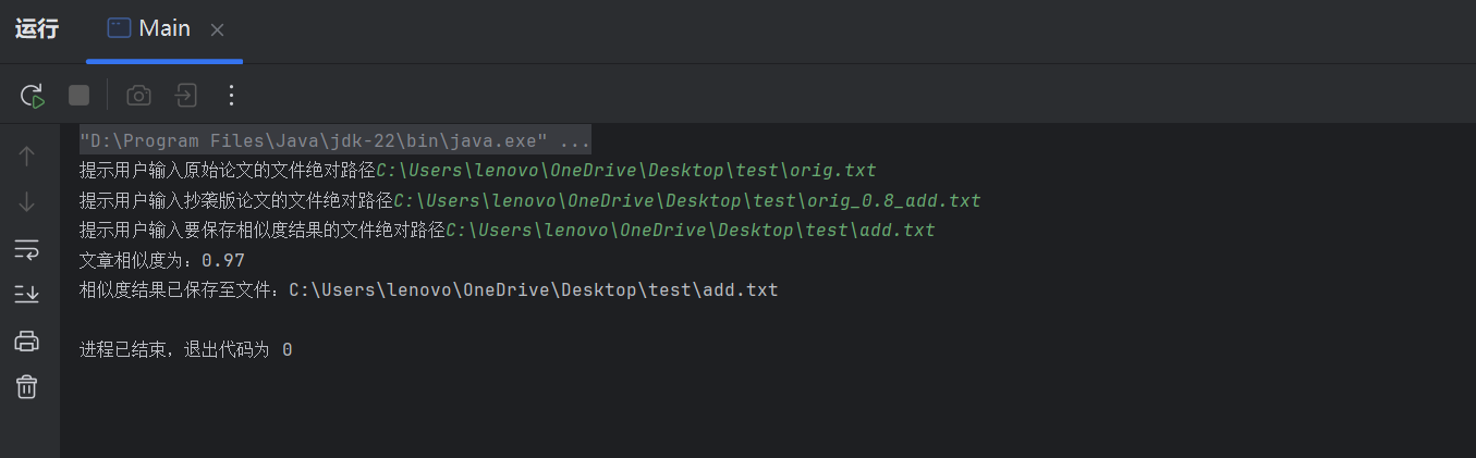 程序把相似度结果写入用户指定的输出文件,并在控制台展示操作结果。