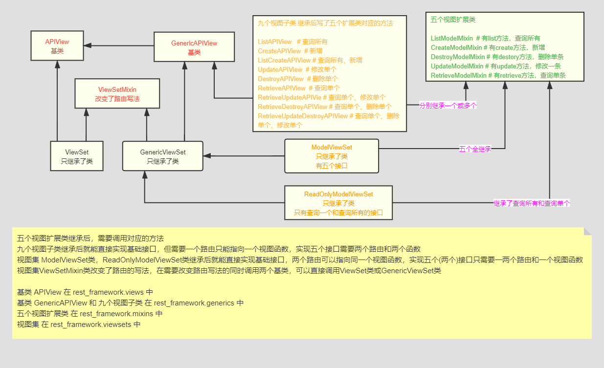 在视图子类中,分别继承了对应的一个或多个视图拓展类和GenericAPIView基类,将对应的请求方式的方法进行的编写