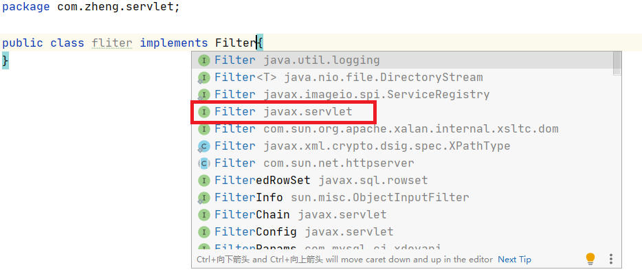 然后创建Java类,实现Filter接口,要注意是javax.servlet下的Filter接口