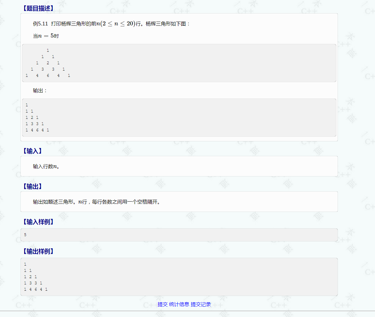 #include<stdio.h> #define N 30 int a[N][N]; int main() { int i,j,n; scanf("%d",&n); for(i=0;i<n;i++) { a[i][0]=1; a[i][i]=1; } for(i=0;i<n;i++) for(j=1;j<i;j++) a[i][j]=a[i-1][j-1]+a[i-1][j]; for(i=0;i<n;i++) { for(j=0;j<=i;j++) printf("%d ",a[i][j]); printf("\n"); } return 0; }