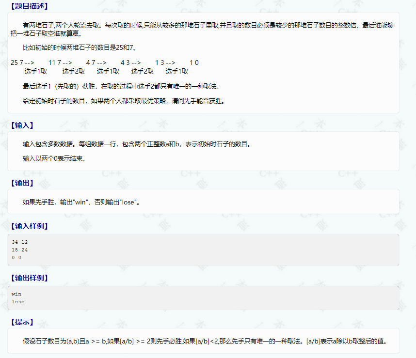 #include<iostream> #include<cstdio> #include<cstring> using namespace std; bool js(int a,int b) { if(a<b) swap(a,b); if(a%b==0) return true; for(int k=a/b;k>=1;k--) if(!js((a-b*k),b)) return true; return false; } int main() { int a,b; while((cin>>a>>b)&&!(a==0&&b==0)){ if(js(a,b)) cout<<"win"<<endl; else cout<<"lose"<<endl; } return 0; }