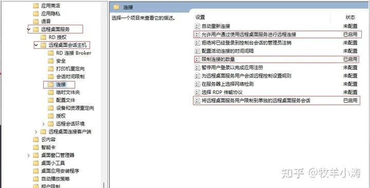 依次选择[计算机配置] --> [管理模板] --> [Windows组件] --> [远程桌面服务] --> [远程桌面会话主机] --> [连接]