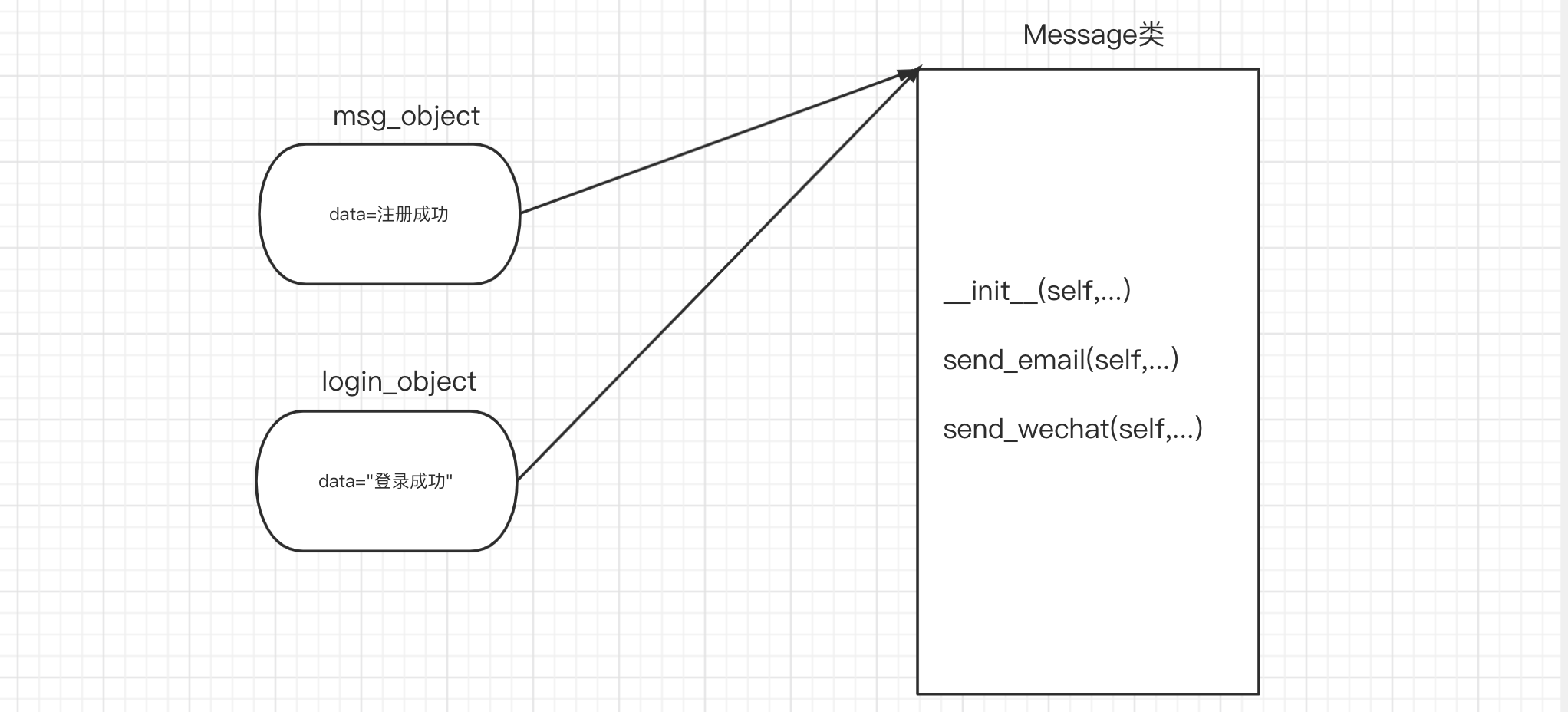 class Message(object): def email(self): """ 发送邮件 :return: """ pass def msg(self): """ 发送短信 :return: """ pass def wechat(self): """ 发送微信 :return: """ pass # 封装 将方法封装到一个类中 -
