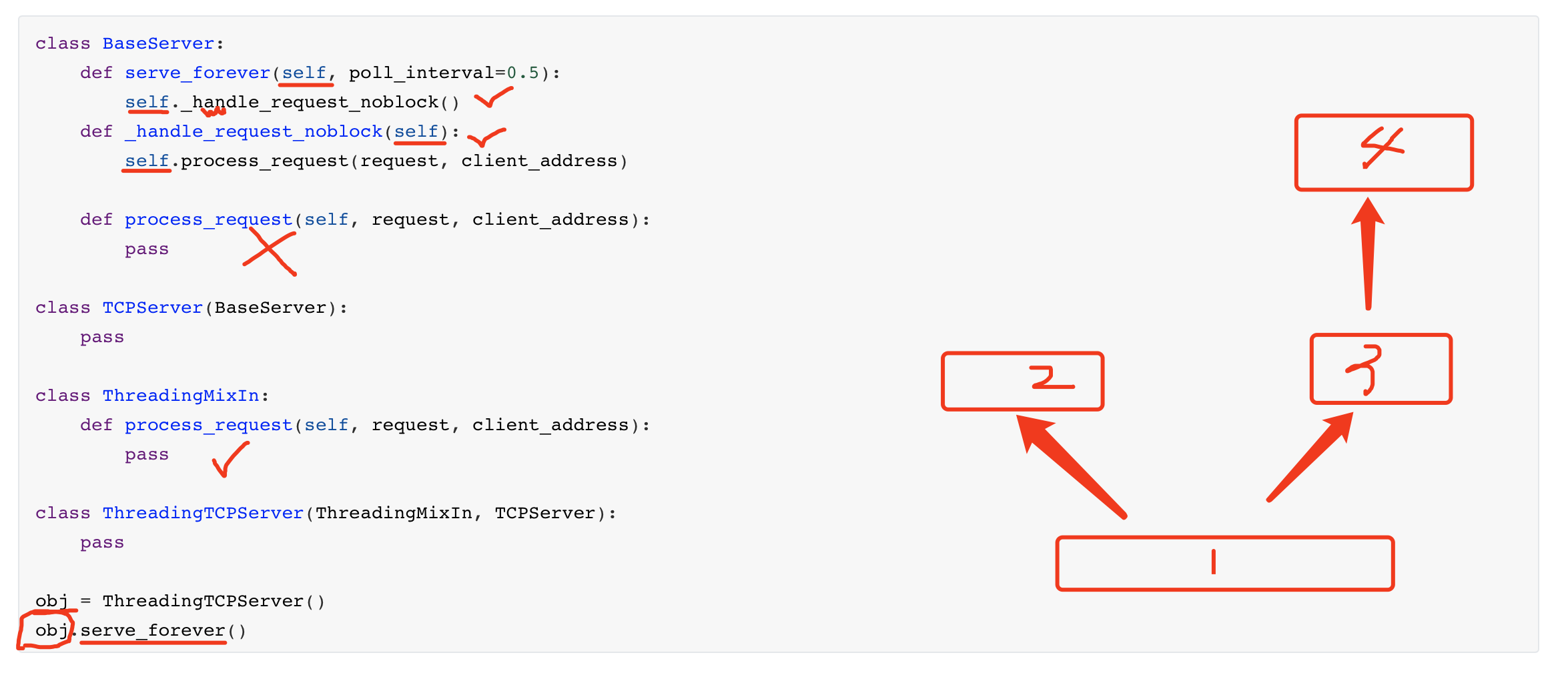 class Base1: def f1(self): print('base1.f1') def f2(self): print('base1.f2') def f3(self): print('base1.f3') self.f1() class Base2: def f1(self): print('base2.f1') class Foo(Base1, Base2): def f0(self): print('foo.f0') self.f3() obj = Foo() obj.f0() # foo.f0 # base1.f3 # base1.f1 -