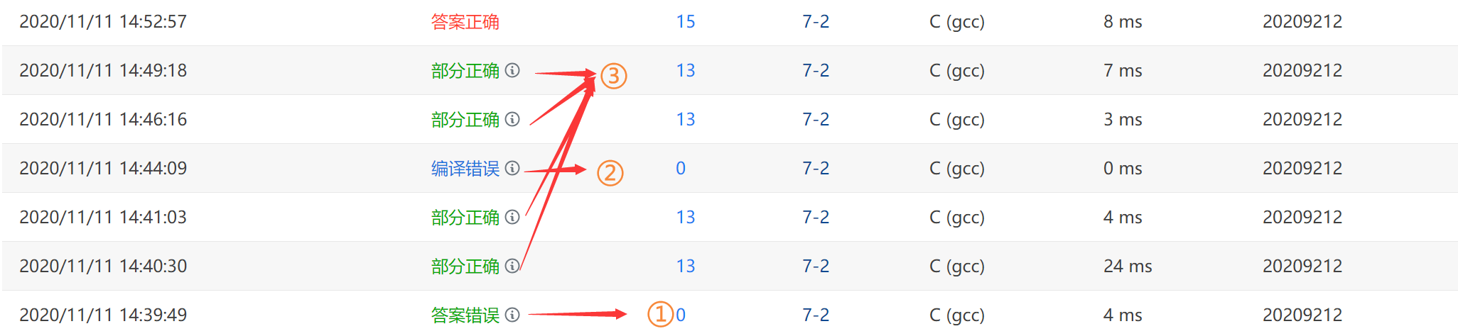 - ①答案错误:思路不正确,打出来的代码不符合要求,以至于答案错误。