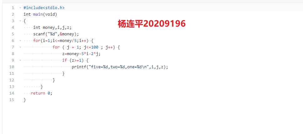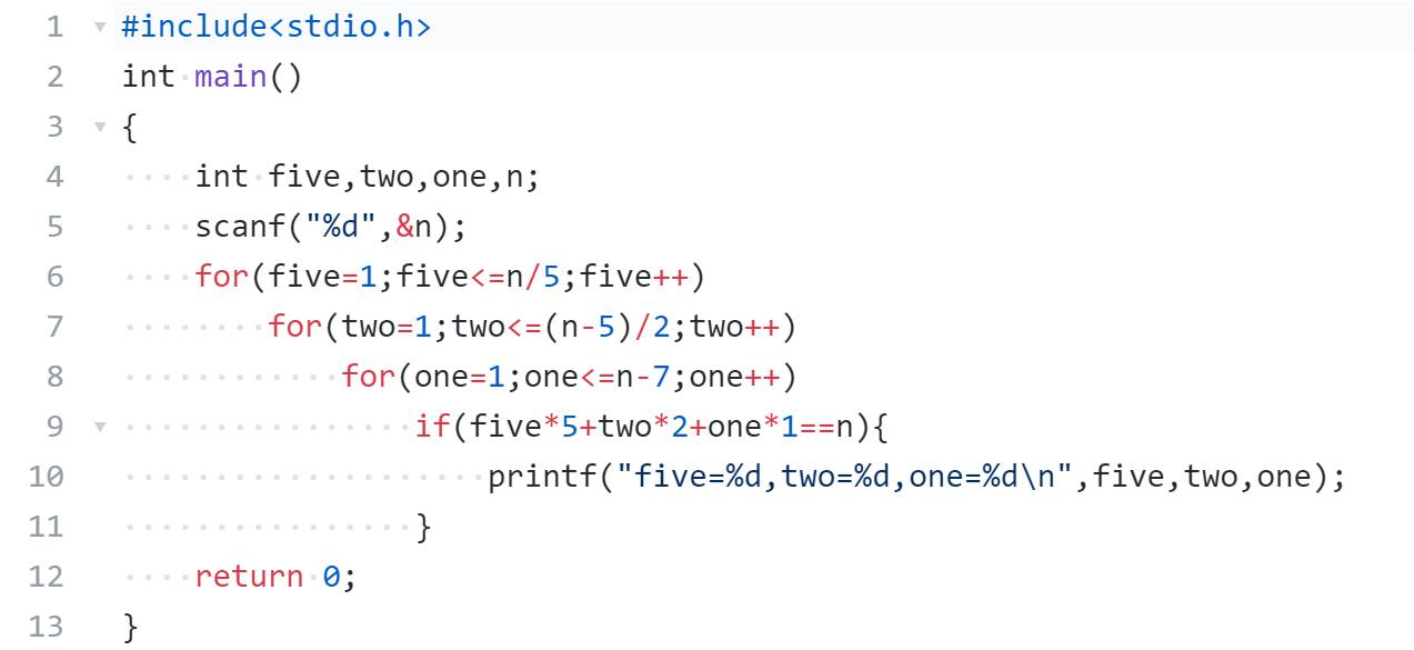1.2 题目:在日常生活中,我们常常需要将一些大额的人民币换算成零钱,已知我们有许多面值5元,2元和1元的人民币。输入我们需要兑换的金钱数,然后我们用这些面值5元,2元和1元的人民币来兑换,要求每一种面值都至少有1张,然后输出有多少种兑换方式。
