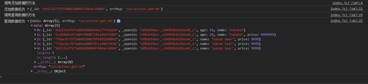 测试:点击新增数据按钮,发现控制台上有相应输出,再进入到云开发的数据库页面,发现上述字段已新增