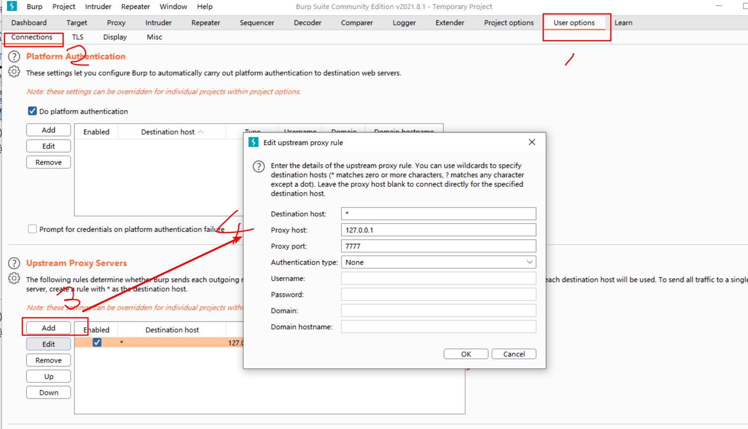 操作步骤:User options ->Connections ->Upstream Proxy Servers 添加ip与端口号 :第一行填* 匹配任意字符,第二行填ip (xray服务所在的ip),第三行填端口号