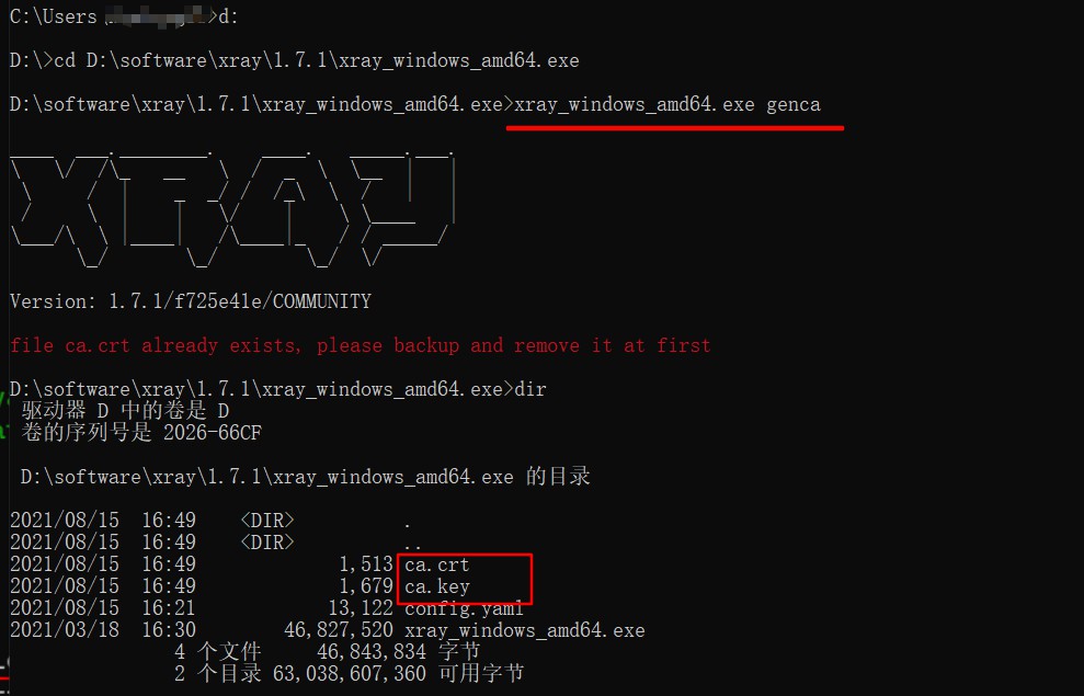 打开Xray所在位置(下载Xray地址),运行xray_windows_amd64.exe genca 生成证书,导入火狐浏览器