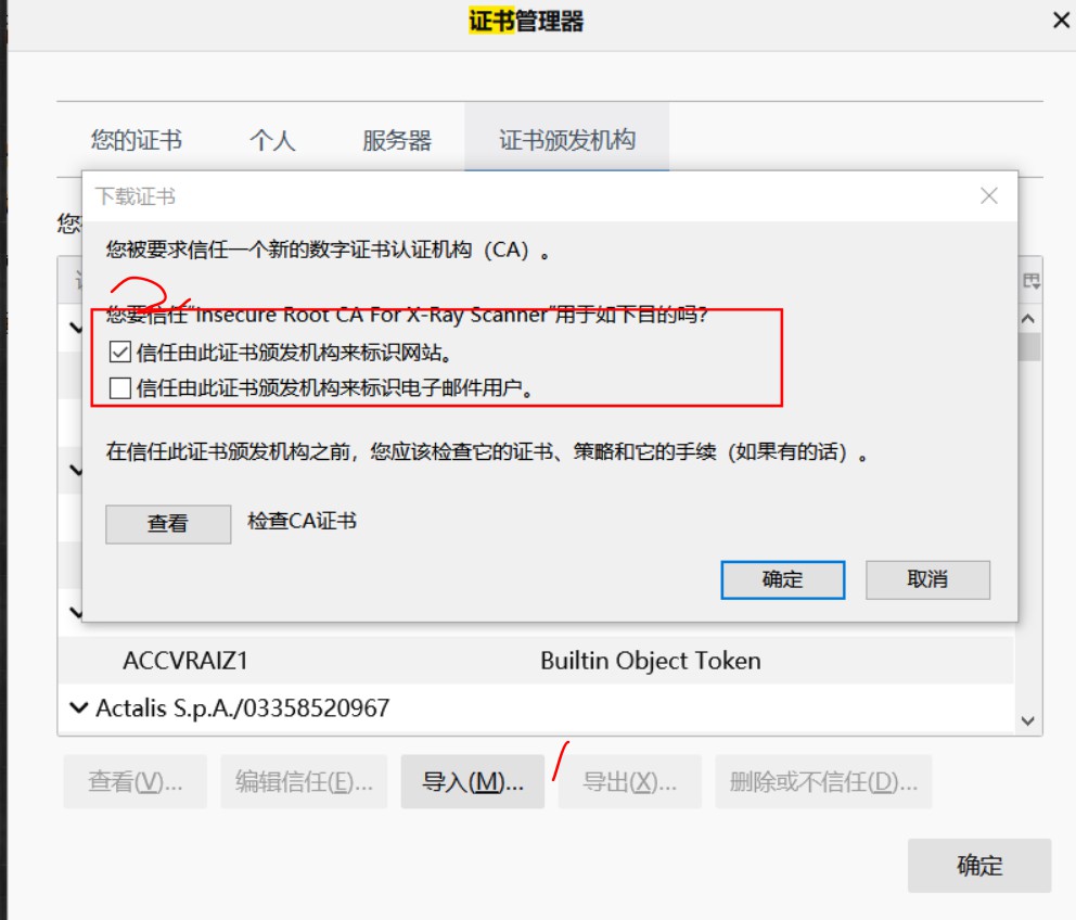 点击火狐浏览器 设置->隐私与安全->证书->点击查看证书 ->弹出证书管理器->导入(①选中刚才生成的证书 ca.crt 文件 ② 勾选信任由此证书颁发机构来标识网站)