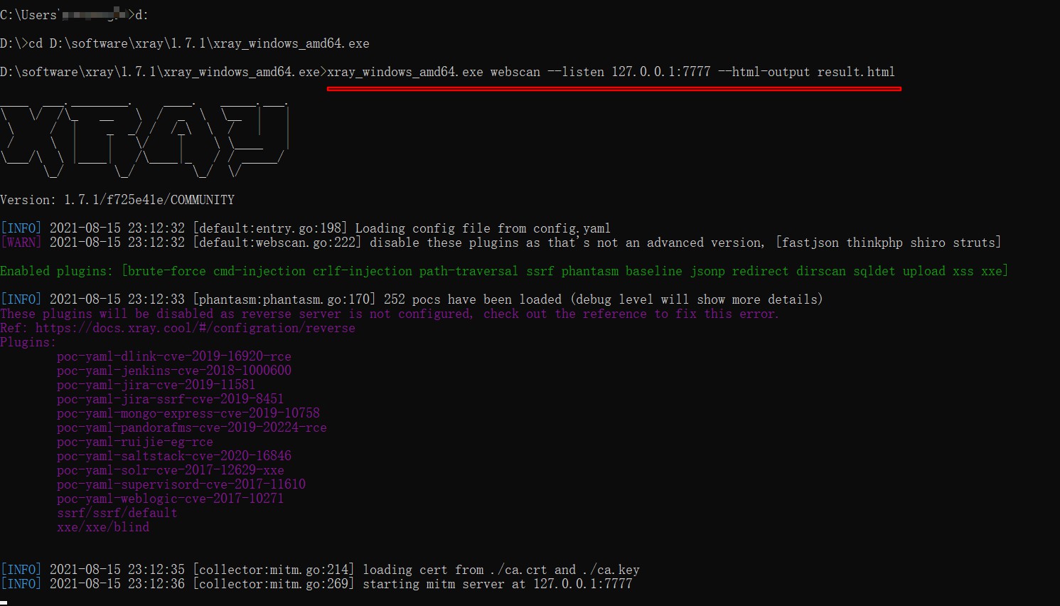 开启监听:xray_windows_amd64.exe webscan --listen 127.0.0.1:7777 --html-output result.html