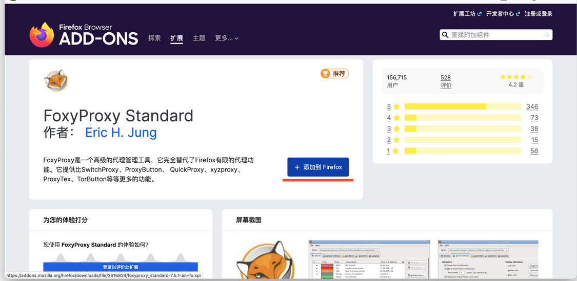 1.火狐浏览器:点击右上角详情->拓展与主题->推荐(列表下拉 点击【寻找更多附加组件】)->输入框(FoxyProxy Standard)->将该组件添加到 Firefox