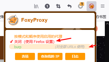 (不用的时候可以将 BurpSuite 设置的两个端口号都 取消复选框 ,火狐浏览器 FoxyProxy 选项 里的代理关闭 )
