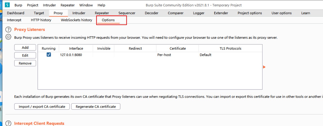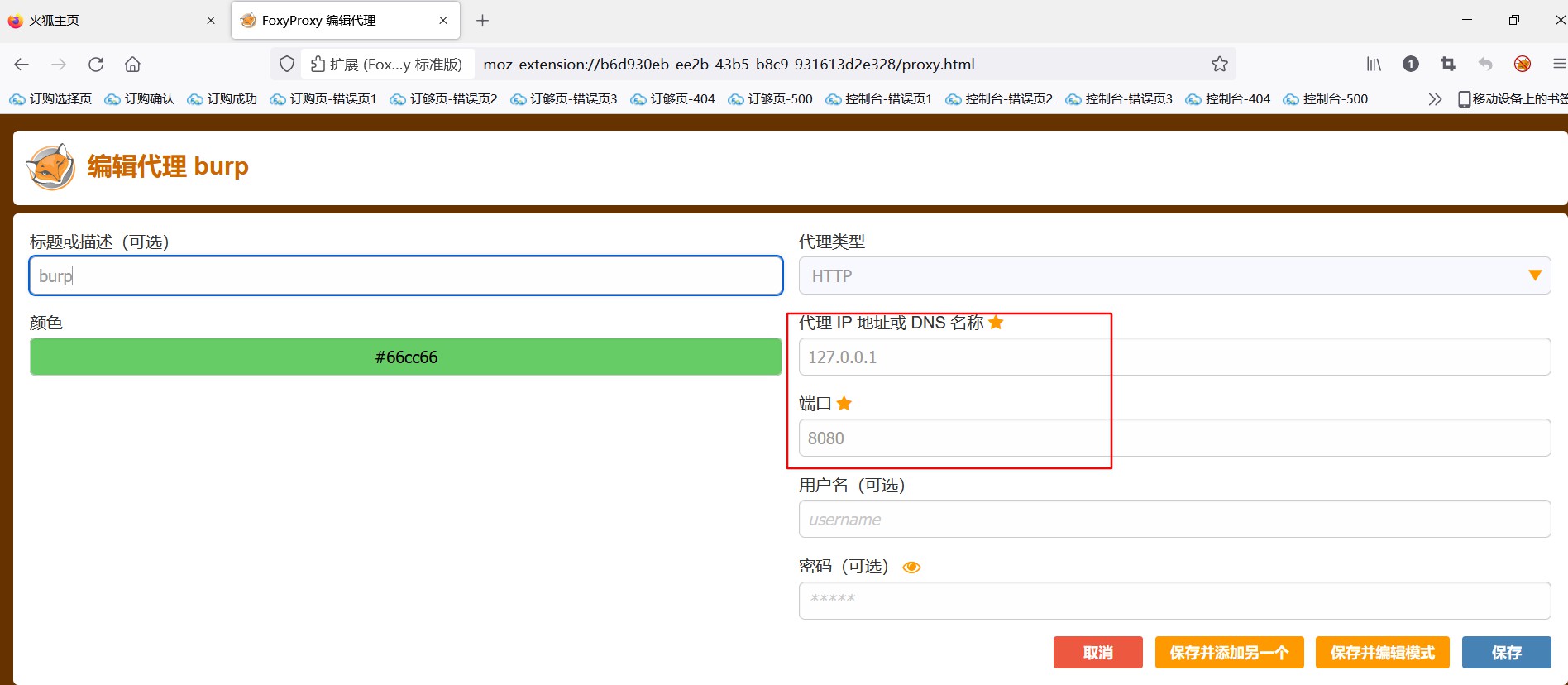 3.添加对应的代理 (burp里的代理端口要和浏览器的端口号一直,都是8080)