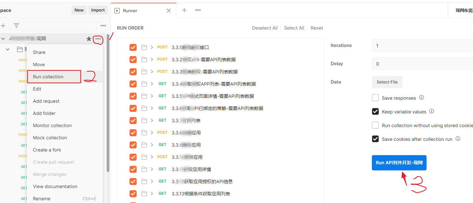 Collections->。。。->Run collection -> 点击Run 可以查看批量批量运行测试用例