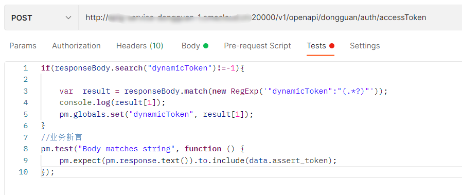 if(responseBody.search("dynamicToken")!=-1){ var result = responseBody.match(new RegExp('"dynamicToken":"(.*?)"')); console.log(result[1]); pm.globals.set("dynamicToken", result[1]); } //业务断言 pm.test("Body matches string", function () { pm.expect(pm.response.text()).to.include(data.assert_token); });