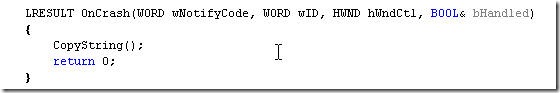 1. 用VC7.1 建立一个WTL的基于Dialog 的工程,加一个按钮Crash, 然后写函数CopyString,这个函数里面递归调用自己,每次让栈分配64K的空间。