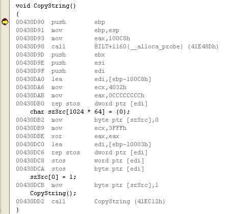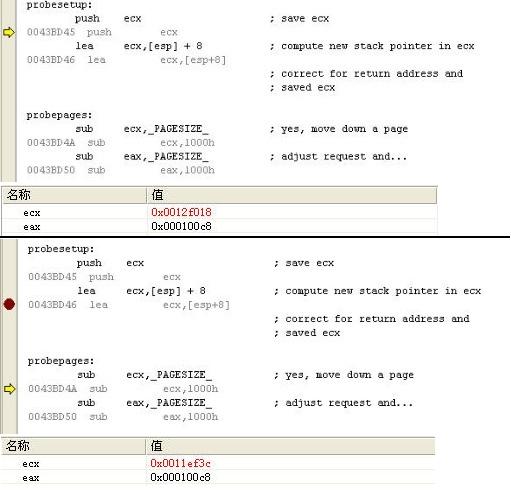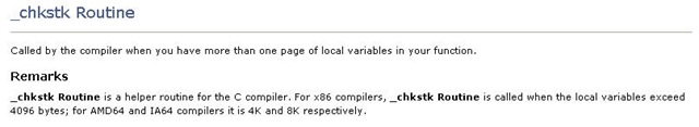 5. 跟进到41E48D,原来是_chkstk 函数的调用。那么这个函数什么情况下调用,为什么要调用呢? 于是看看MSDN。