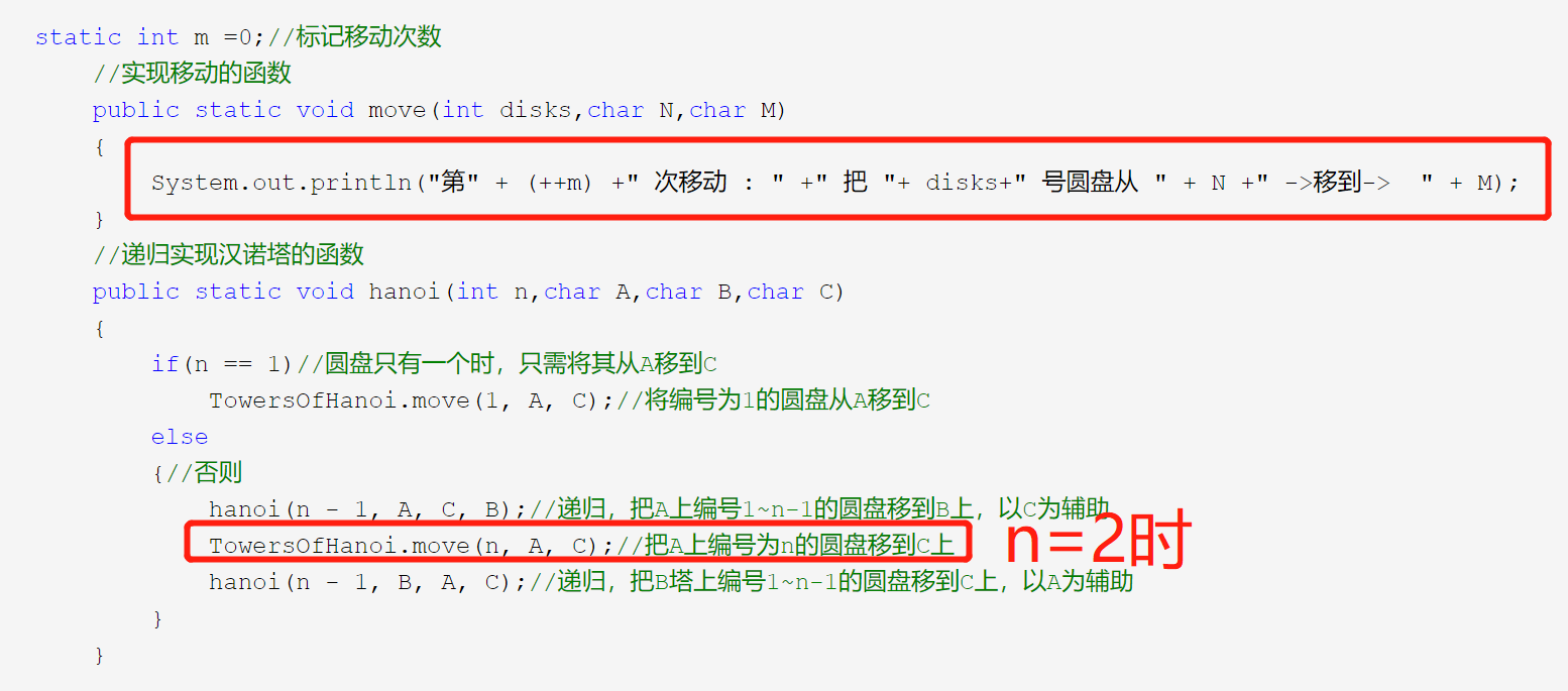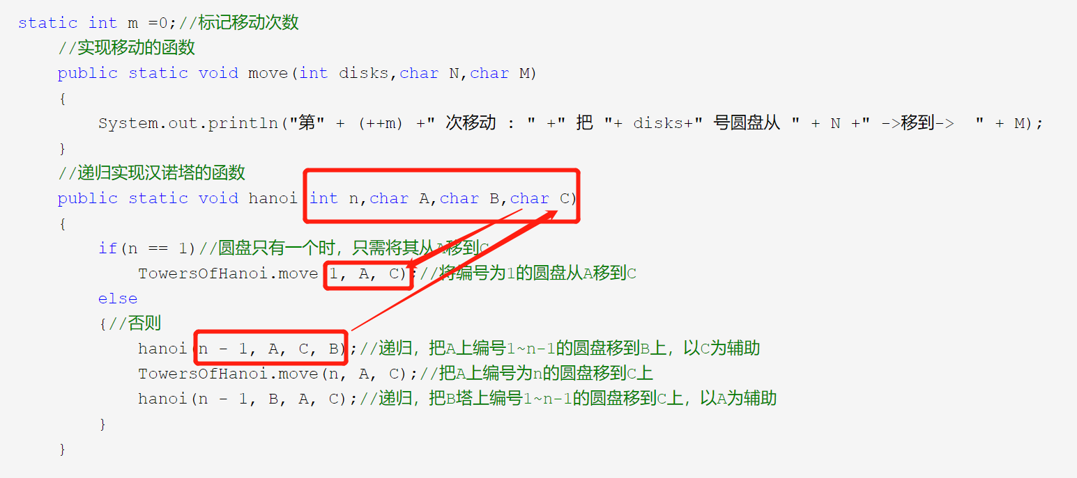 static int m =0;//标记移动次数 //实现移动的函数 public static void move(int disks,char N,char M) { System.out.println("第" + (++m) +" 次移动 : " +" 把 "+ disks+" 号圆盘从 " + N +" ->移到-> " + M); } //递归实现汉诺塔的函数 public static void hanoi(int n,char A,char B,char C) { if(n == 1)//圆盘只有一个时,只需将其从A移到C TowersOfHanoi.move(1, A, C);//将编号为1的圆盘从A移到C else {//否则 hanoi(n - 1, A, C, B);//递归,把A上编号1~n-1的圆盘移到B上,以C为辅助 TowersOfHanoi.move(n, A, C);//把A上编号为n的圆盘移到C上 hanoi(n - 1, B, A, C);//递归,把B塔上编号1~n-1的圆盘移到C上,以A为辅助 } }