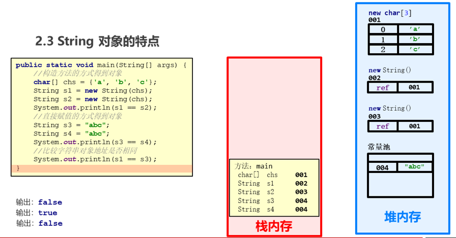 2)以“”方式给出的字符串,只要字符串序列相同(顺序和大小写),无论在程序代码中出现几次,JVM都只会建立一个String对象,并在字符串池中维护