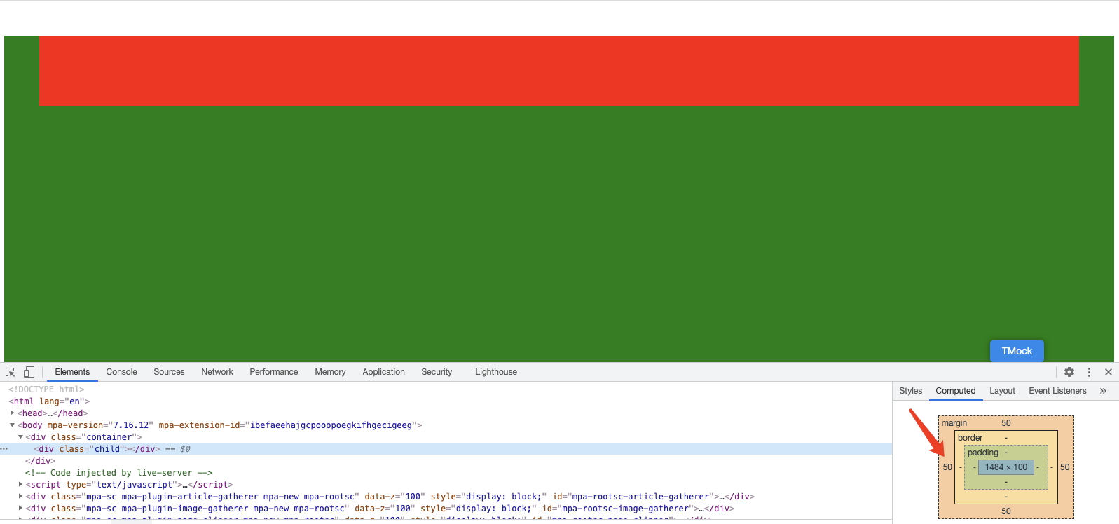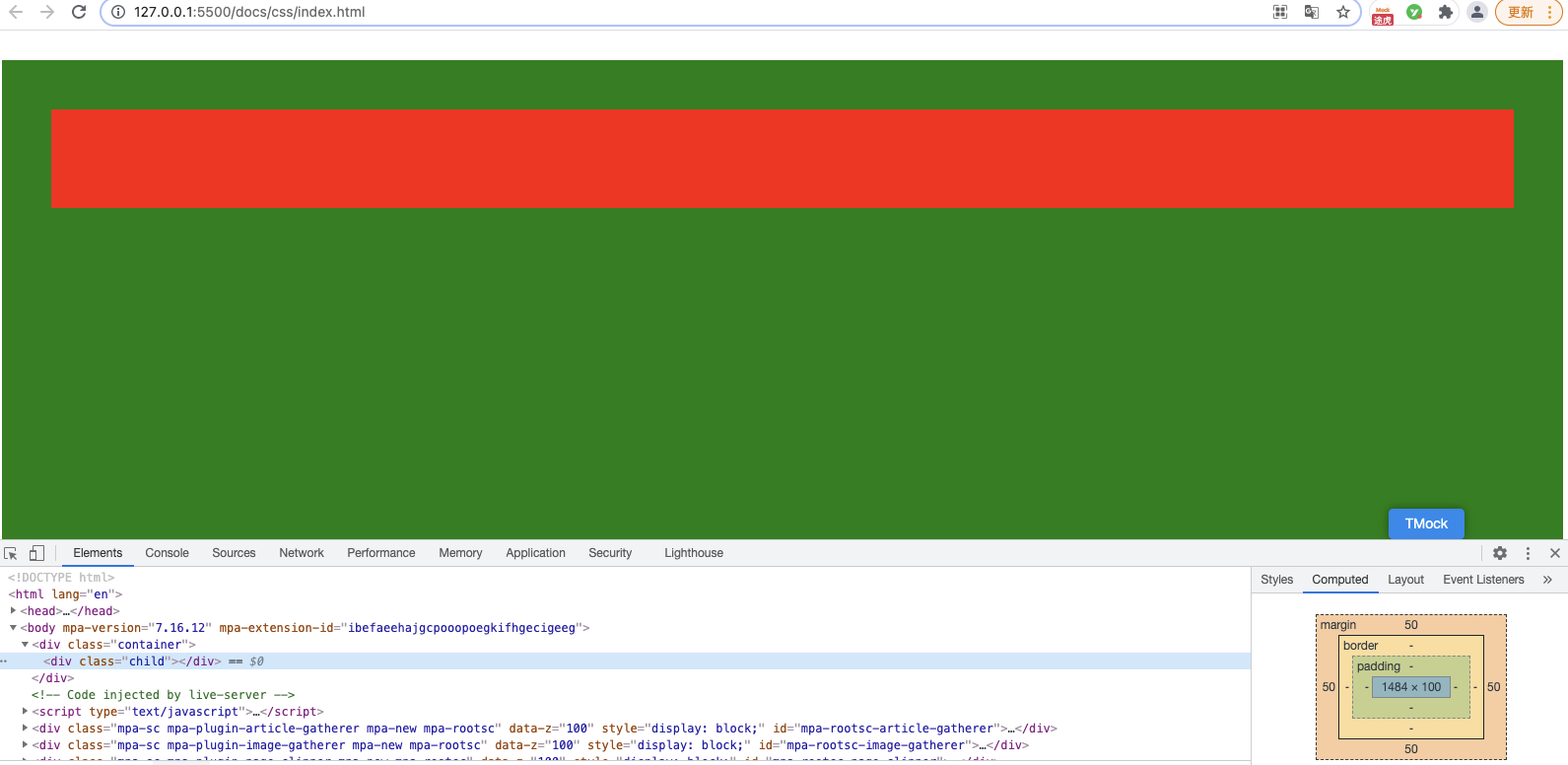 .container { background: green; height: 500px; margin-top: 30px; /* 给父元素创建bfc */ overflow: hidden; } .container .child { height: 100px; margin: 50px; background: red; }
