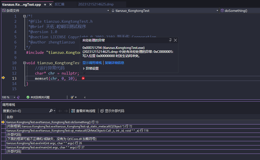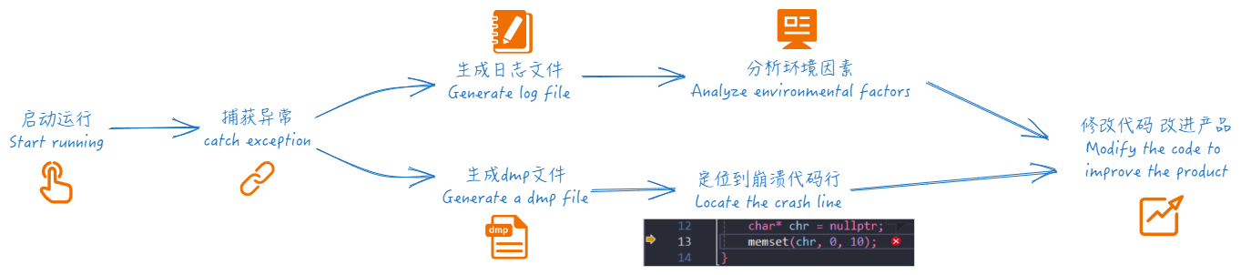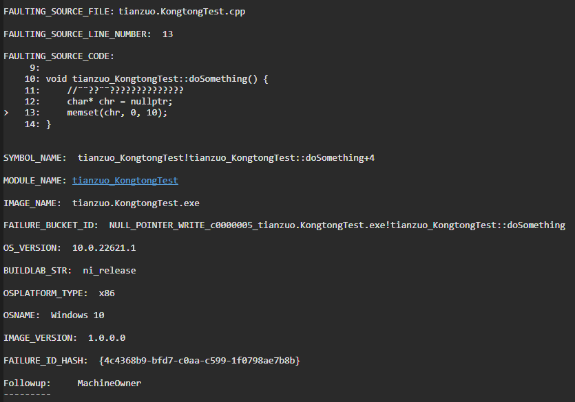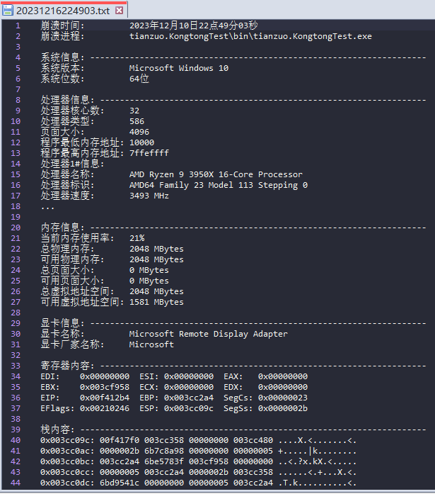 天佐.崆峒印 Windows平台下应用程序发生崩溃时, 生成崩溃转储文件用于分析定位到崩溃代码行,同时生成系统环境相关信息。