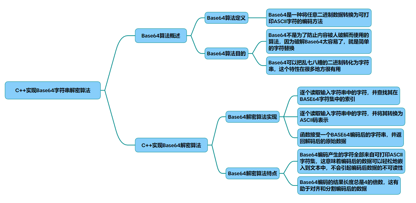 以下是C++实现的Base64字符串解密算法及核心原理说明,结合技术文档和实现要点: