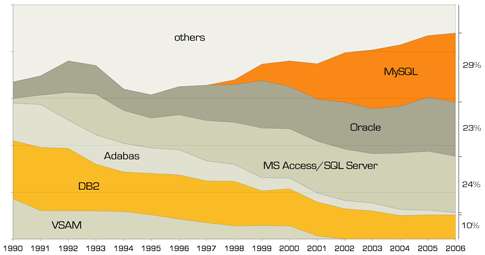 - MySQL :MySQL的最初的核心思想,主要是开源、简便易用。其开发可追溯至1985年,而第一个内部发行版本诞生,已经是1995年。到1998年,MySQL已经可以支持10中操作系统了,其中就包括win平台。但依然问题多多,如不支持事务操作、子查询 、外键、存储过程和视图等功能。从这张截止至2006年的数据库市场占有率图:![]() 可以看出,MySQL的爆发实际是在01、02年,尤其是02年发布的4.0 Beta版,正式选定InnoDB作为默认引擎,对事务处理能力及数据缓存能力有了极大的提高。同年4.1版开始支持子查询,至此MySQL终于蜕变成一个成熟的关系型数据库系统。05年的5.0版本又添加了存储过程、服务端游标、触发器、查询优化以及分布式事务功能,但同年被Oracle抄了后路,InnoDB被Oracle收编。08年,MySQL被Sun收购,09年,Oracle收购了Sun和MySQL。由于MySQL的早期定位,其主要应用场景就是互联网开发。基本上,互联网的爆发成就了MySQL,LAMP架构风靡天下。而由于MySQL更多的的追求轻量、易用,以及早期的事物操作及复杂查询优化的缺失,在传统的数据库应用场景中,份额极少。 可以看出,MySQL的爆发实际是在01、02年,尤其是02年发布的4.0 Beta版,正式选定InnoDB作为默认引擎,对事务处理能力及数据缓存能力有了极大的提高。同年4.1版开始支持子查询,至此MySQL终于蜕变成一个成熟的关系型数据库系统。05年的5.0版本又添加了存储过程、服务端游标、触发器、查询优化以及分布式事务功能,但同年被Oracle抄了后路,InnoDB被Oracle收编。08年,MySQL被Sun收购,09年,Oracle收购了Sun和MySQL。由于MySQL的早期定位,其主要应用场景就是互联网开发。基本上,互联网的爆发成就了MySQL,LAMP架构风靡天下。而由于MySQL更多的的追求轻量、易用,以及早期的事物操作及复杂查询优化的缺失,在传统的数据库应用场景中,份额极少。