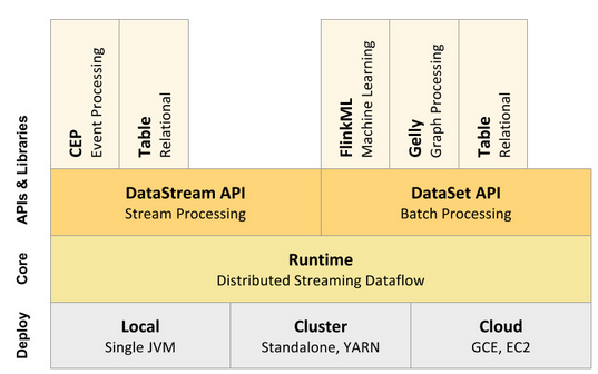 【1】API&Libraries层:作为分布式数据处理框架,Flink同时提供了支撑流计算和批计算的接口,同时在此基础之上抽象出不同的应用类型的组件库,如基于流处理的CEP(复杂事件处理库)、SQL&Table库和基于批处理的FlinkML(机器学习库)等、Gelly(图处理库)等。API层包括构建流计算应用的DataStream API 和批计算应用的DataSet API,两者都提供给用户丰富的数据处理高级API,例如Map、FlatMap操作等,同时也提供比较低级的Process Function API,用户可以直接操作状态和时间等底层数据。