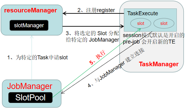 作业调度的基础是首先提供对资源的管理,因此我们首先来看下 Flink 中资源管理的实现。Flink 中的资源是由 TaskExecutor 上的 Slot 来表示的。如下图所示,在 ResourceManager 中,有一个子组件叫做 SlotManager,它维护了当前集群中所有 TaskExecutor 上的 Slot 的信息与状态,如该 Slot 在哪个TaskExecutor 中,该 Slot 当前是否空闲等。当 JobManger 来为特定 Task 申请资源的时候,根据当前是 Per-job 还是 Session 模式,ResourceManager 可能会去申请资源来启动新的TaskExecutor。当 TaskExecutor启动之后,它会通过服务发现找到当前活跃的 ResourceManager 并进行注册。在注册信息中,会包含该 TaskExecutor 中所有 Slot 的信息。 ResourceManager 收到注册信息后,其中的 SlotManager 就会记录下相应的 Slot 信息。当 JobManager 为某个 Task 来申请资源时, SlotManager 就会从当前空闲的 Slot 中按一定规则选择一个空闲的 Slot进行分配。当分配完成后,RM 会首先向 TaskManager 发送 RPC要求将选定的 Slot 分配给特定的 JobManager。TaskManager 如果还没有执行过该 JobManager 的 Task 的话,它需要首先向相应的 JobManager 建立连接,然后发送提供 Slot 的 RPC 请求。在 JobManager 中,所有 Task 的请求会缓存到SlotPool 中。当有 Slot 被提供之后,SlotPool 会从缓存的请求中选择相应的请求并结束相应的请求过程。