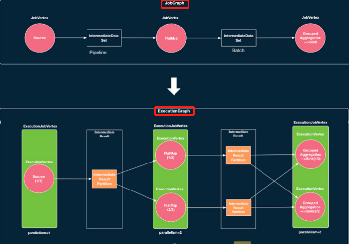 基于上述 Slot 管理和分配的逻辑,JobManager 负责维护作业中 Task 执行的状态。如上所述,Client 端会向 JobManager 提交一个 JobGraph,它代表了作业的逻辑结构。JobManager 会根据 JobGraph 按并发展开,从而得到JobManager 中关键的 ExecutionGraph。ExecutionGraph 的结构如下图所示,与 JobGraph 相比,ExecutionGraph 中对于每个 Task 与中间结果等均创建了对应的对象,从而可以维护这些实体的信息与状态。