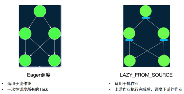 在一个 Flink Job 中是包含多个 Task 的,因此另一个关键的问题是在 Flink 中按什么顺序来调度 Task。如下图所示,目前 Flink 提供了两种基本的调度逻辑,即Eager 调度与 Lazy From Source。Eager 调度如其名所示,它会在作业启动时申请资源将所有的 Task 调度起来。这种调度算法主要用来调度可能没有终止的流作业。与之对应,Lazy From Source 则是从 Source 开始,按拓扑顺序来进行调度。简单来说,Lazy From Source 会先调度没有上游任务的 Source 任务,当这些任务执行完成时,它会将输出数据缓存到内存或者写入到磁盘中。然后,对于后续的任务,当它的前驱任务全部执行完成后,Flink 就会将这些任务调度起来。这些任务会从读取上游缓存的输出数据进行自己的计算。这一过程继续进行直到所有的任务完成计算。