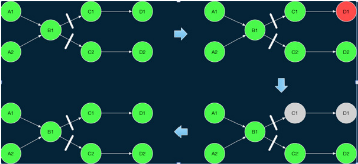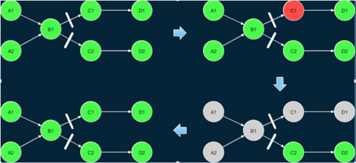 如果是由于上游失败导致的错误,那么需要同时重启上游的 Region和下游的 Region。实际上,如果下游的输出使用了非确定的数据分割方式,为了保持数据一致性,还需要同时重启所有上游Region和下游Region。
