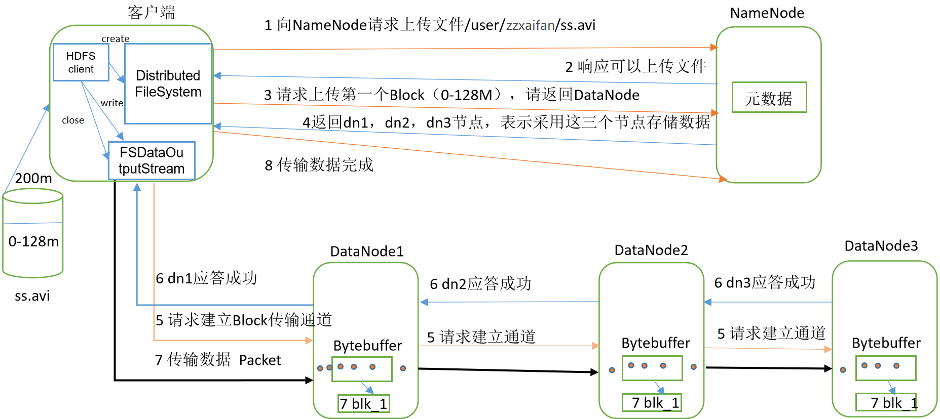 HDFS 文件写入流程图如下:三个模块(客户端、NameNode、DataNode)