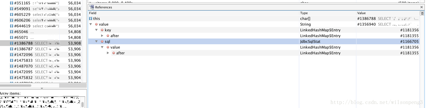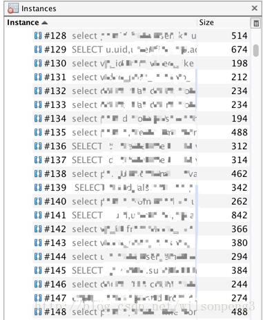 dump下来的文件大约 1.8g,用 jvisualvm查看,发现用 char[]类型的数据占用了41%内存,同时另外一个 JdbcSqlStat类型的数据占用了35%的内存,也就是说整个堆中几乎全是这两类数据。如下图: