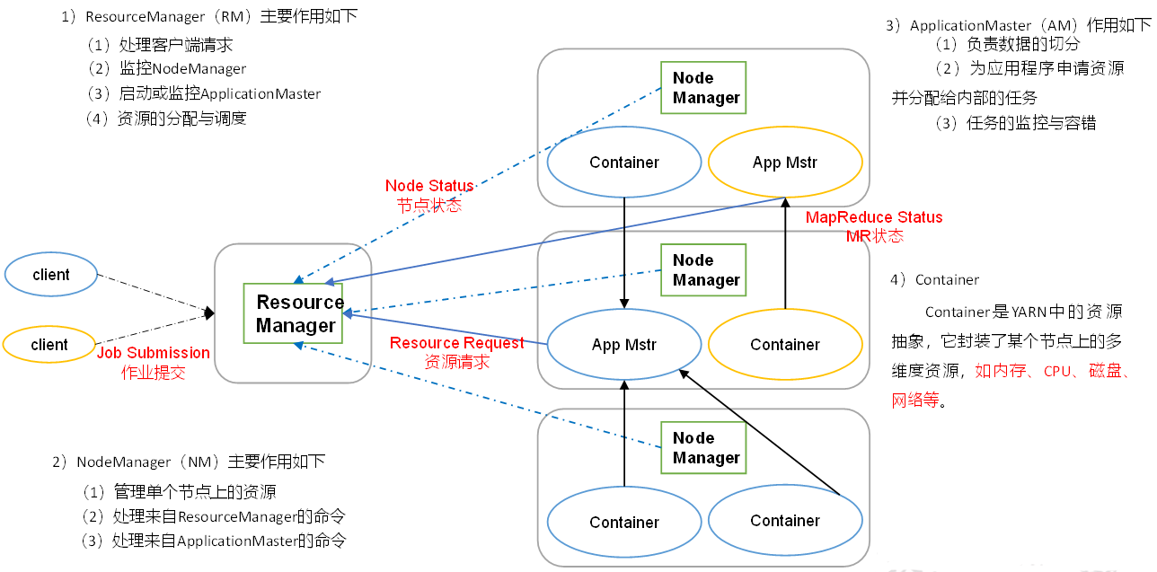从 YARN的架构图来看,它主要由ResourceManager、NodeManager、ApplicationMaster和Container等组件构成: