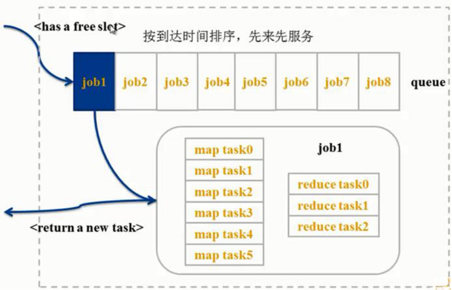 【1】先进先出调度器(FIFO):FIFO 是 Hadoop中默认的调度器,也是一种批处理调度器。它先按照作业的优先级高低,再按照到达时间的先后选择被执行的作业。原理图如下所示。