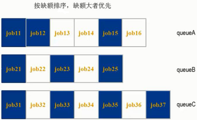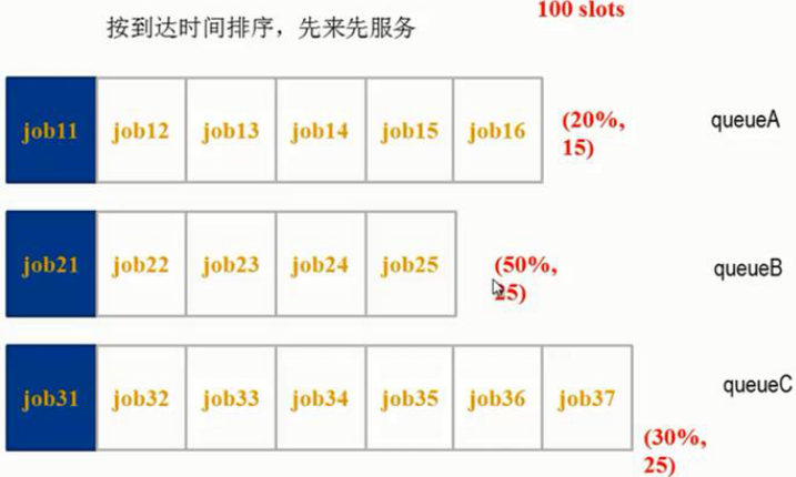 比如我们分为三个队列:queueA、queueB和 queueC,每个队列的 job 按照到达时间排序。假如这里有100个slot,queueA分配20%的资源,可配置最多运行15个task,queueB 分配50%的资源,可配置最多运行25个task,queueC分配30%的资源,可配置最多运行25个task。这三个队列同时按照任务的先后顺序依次执行,比如,job11、job21和job31分别排在队列最前面,是最先运行,也是同时运行。