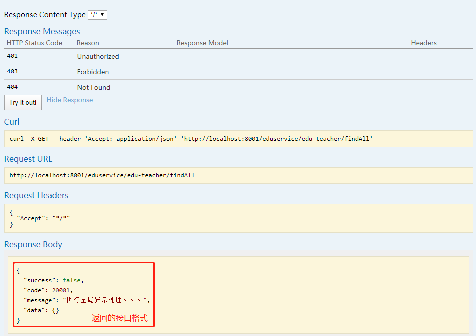 1 /** 2 * <p> 3 * 讲师 前端控制器 4 * </p> 5 * 6 * @author zhengzhaoxiang 7 * @since 2020-06-01 8 */ 9 @RestController 10 @RequestMapping("/eduservice/edu-teacher") 11 public class EduTeacherController { 12 @Autowired 13 private EduTeacherService eduTeacherService; 14 15 /** 16 * @Description 获取所有数据 17 * @Author zhengzhaoxiang 18 * @Date 2020/6/2 15:27 19 * @Param [] 20 * @Return void 21 */ 22 @GetMapping("findAll") 23 public R findAll(){ 24 25 List<EduTeacher> list = eduTeacherService.list(null); 26 try{ 27 int i = 1/0; 28 } catch (Exception e){ 29 //手动抛出异常 30 throw new BusinessException(20001,"手动异常抛出"); 31 } 32 33 return R.ok().data("items",list); 34 } 35 }