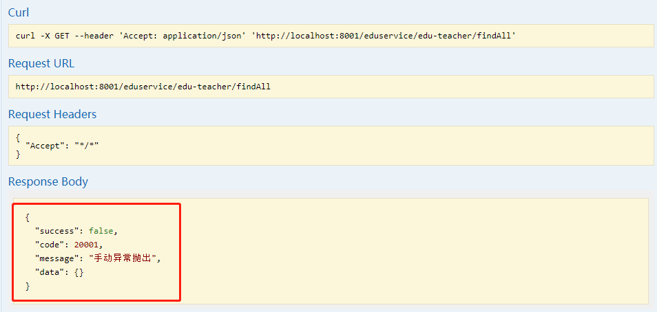 【3】在业务代码根据需求进行手动抛出即可,业务代码展示:throw new BusinessException(20001,"手动异常抛出");