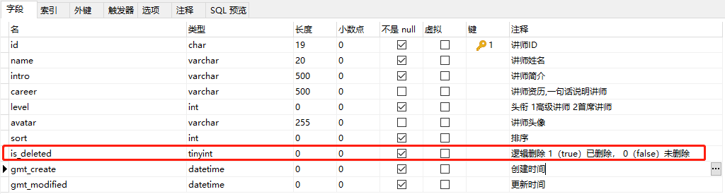 1 /** 2 * <p> 3 * 讲师 4 * </p> 5 * 6 * @author zhengzhaoxiang 7 * @since 2020-06-01 8 */ 9 @Data 10 @EqualsAndHashCode(callSuper = false) 11 @Accessors(chain = true) 12 @ApiModel(value="EduTeacher对象", description="讲师") 13 public class EduTeacher implements Serializable { 14 15 private static final long serialVersionUID = 1L; 16 17 @TableLogic 18 @ApiModelProperty(value = "逻辑删除 1(true)已删除, 0(false)未删除") 19 private Integer isDeleted; 20 }