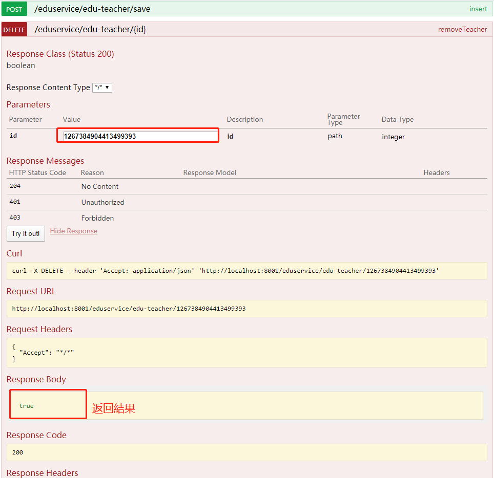 1 /** 2 * <p> 3 * 讲师 前端控制器 4 * </p> 5 * 6 * @author zhengzhaoxiang 7 * @since 2020-06-01 8 */ 9 @RestController 10 @RequestMapping("/eduservice/edu-teacher") 11 public class EduTeacherController { 12 @Autowired 13 private EduTeacherService eduTeacherService; 14 15 @DeleteMapping("{id}") 16 public boolean removeTeacher(@PathVariable Integer id){ 17 boolean b = eduTeacherService.removeById(id); 18 return b; 19 } 20 }