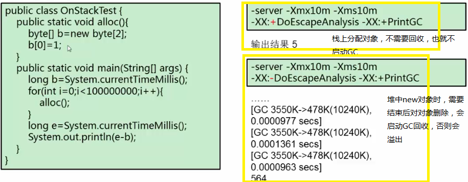 【1】小对象(一般几十个bytes),在没有逃逸(就是在其他线程中也要使用)的情况下,可以直接分配在栈上;