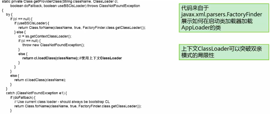 解决:Thread.setContextClassLoader():①、上下文加载器。②、是一个角色。③、是以解决顶层 ClassLoader无法访问底层 ClassLoader的类的问题。④、基本思想是:在顶层的 ClassLoader传入底层 ClassLoder的实例。