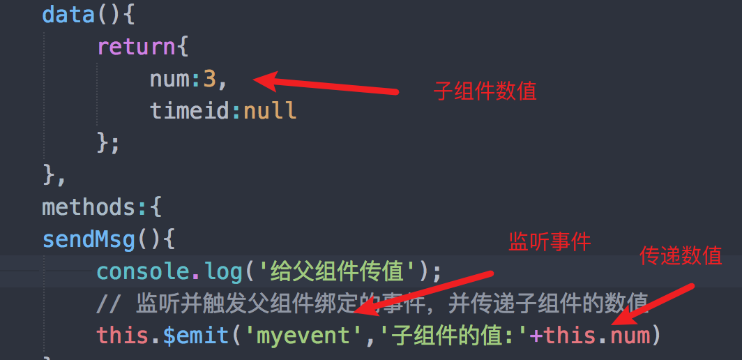 在父组件绑定事件,并调用一个方法去接受子组件传递过来的数值